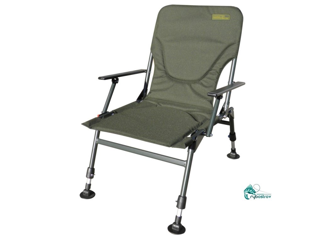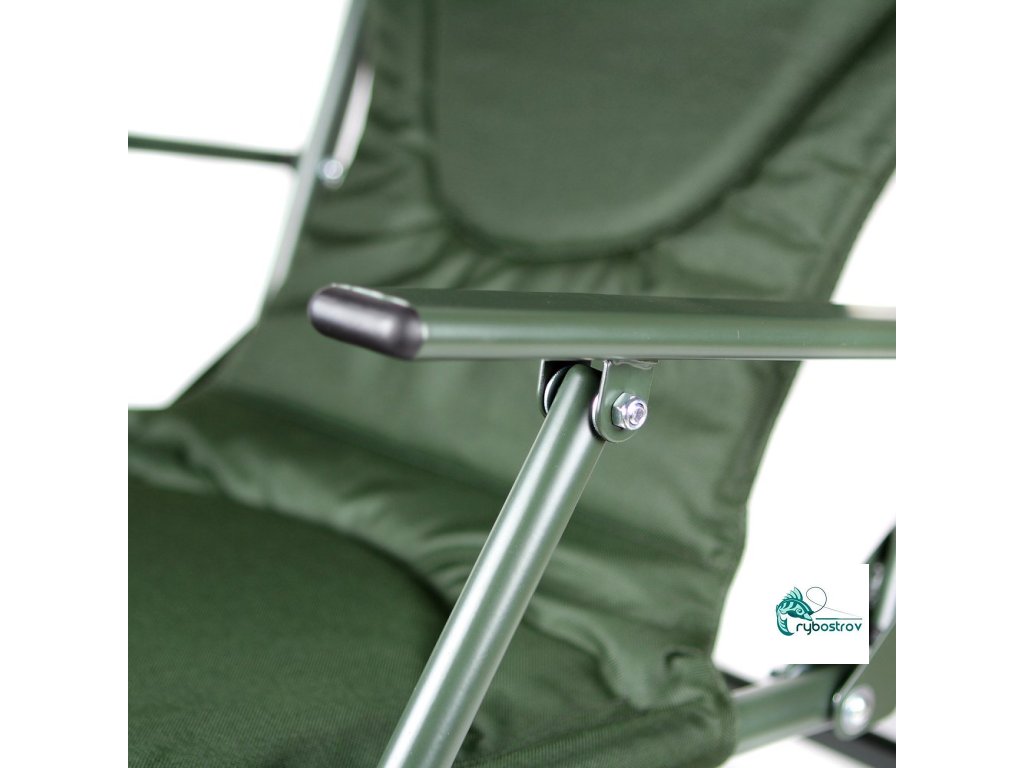 Polstrované operadlo a sedadlo, ľahký oceľový rám a pohodlná hliníková lakťová opierka. Extra veľké sklopné nožičky zaisťujú stabilitu aj na klesajúcom podklade.