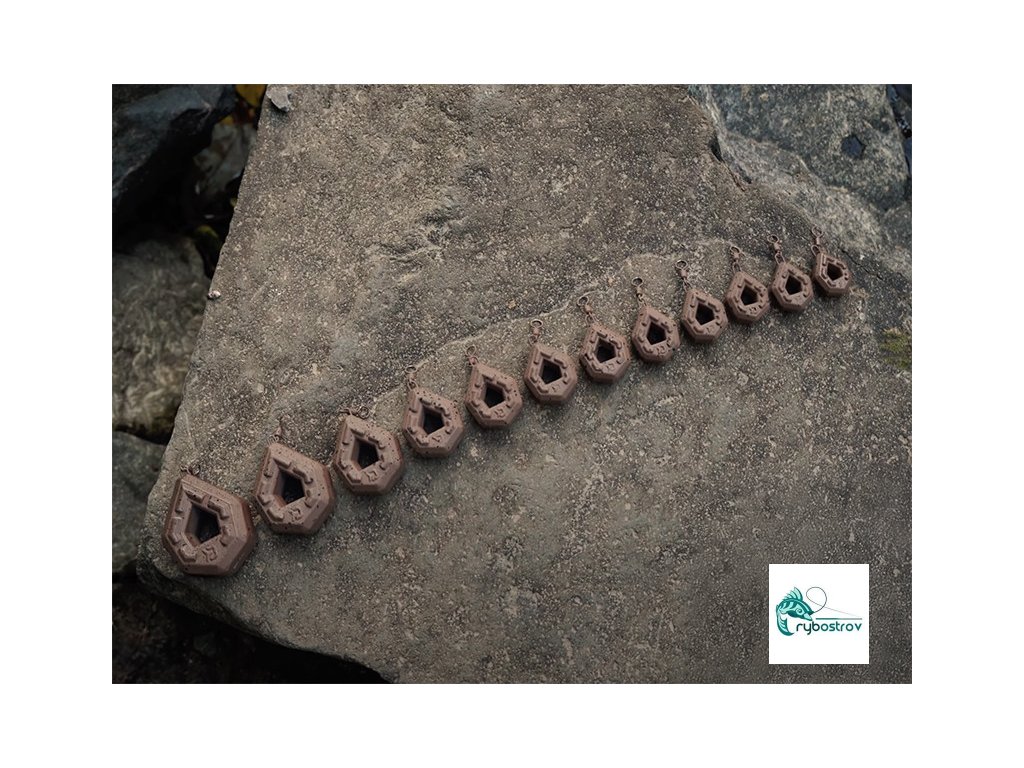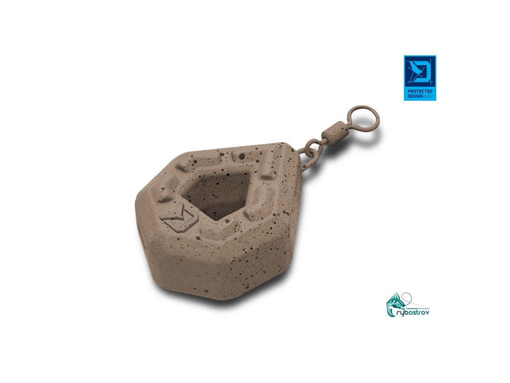 Je inovatívna záťaž dizajnovaná tímom značky Delphin, vhodná pri love na odhod na členitom dne, alebo pri love na tečúcich vodách. Vďaka jedinečnému hranatému tvaru bolo možné vytvoriť kompaktnejšiu záťaž, ktorá má pri menších vonkajších rozmeroch rovnakú hmotnosť ako bežne predávané olová podobného typu. To zaručí výborné nahadzovacie vlastnosti a rýchle klesanie ku dnu. Pre docielenie čo najdlhších a najpresnejších hodov je navyše spodná časť záťaže rozšírená, aby sa tu koncentrovalo viac hmoty a tak predlžuje Vaše hody o ďalšie dôležité metre! Výstupky na hlavných plochách záťaže eliminujú kĺzanie po dne. Otvor v strede záťaže umožňuje rýchlejšie klesanie montáže vodným stĺpcom. Povrch záťaže je chránený farbou v prírodných odtieňoch hnedej s čiernymi fŕkancami, čo dokonale kamufluje jej prítomnosť na dne. Zväčšené očko na obratlíku umožňuje jednoduchšie a rýchlejšie upevnenie záťaže na montáž.