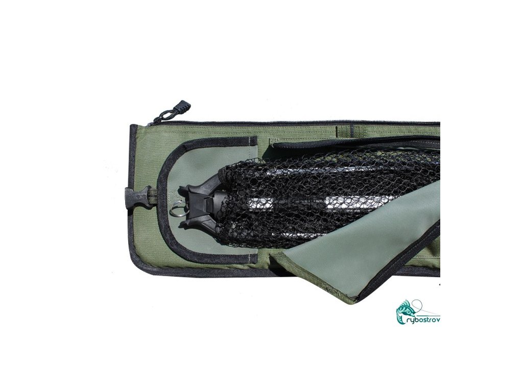 Model má po strane extra dlhé vrecko so zipsom, ktoré slúži napríklad na transport rybárskeho podberáku. Na ňom sú našité uloženia na rázsošky aj so sťahovacou páskou. Toto puzdro tak pojme väčšinu ťažko skladného rybárskeho náčinia.