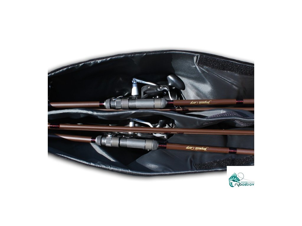 Puzdro je plne polstrované 6mm výstelkou na každej stene, vrátane predeľovacej steny. Tým pádom nehrozí pri transporte 2 prútov ich vzájomné poškodenie. Obe vnútorné komory na prúty sú fixovateľné pomocou suchého zipsu na ich vrchu. Pri navrhovaní puzdier sme mysleli na uloženie najväčších navijakov a dovolíme si tvrdiť, že je sem možné uložiť 99,9% bežne používaných kaprárskych zostáv, vrátane tých, s očkami veľkosti 50mm!